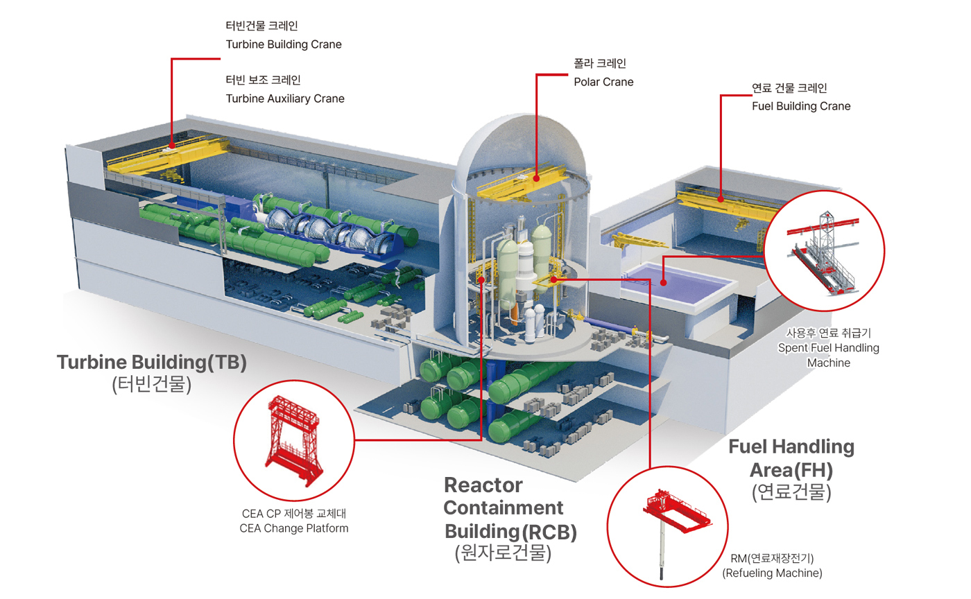 당사는 원자력 산업으로도 사업을 확장하여 원자로 건물의 장치 및 장비를 운반하는 폴라 크레인(Polar Crane)의 설계 및 제작을 수행하고 있으며, 향후 연료취급설비(Fuel Handling Equipment)의 제작 및 시운전을 수행할 계획입니다.